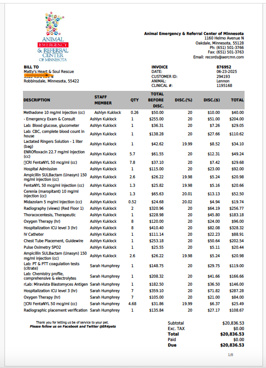 He was a loving and incredibly brave boy, but despite every effort, he couldn’t overcome his illness. We’re so grateful he spent his final days surrounded by love, thanks to his amazing foster family. In our fight to save Lennon, we incurred over $30,000 in veterinary bills. Below is just one screenshot of his many bills. We did everything we could to give him a chance—and now we’re reaching out for help.